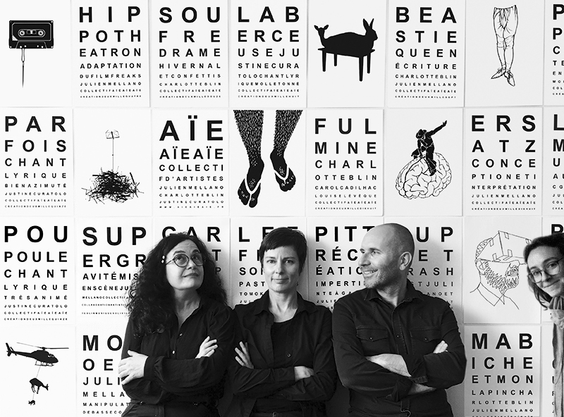 In addition to being the phonic manifestation of a presupposed drama, AÏE AÏE AÏE is a collective of artists who explore the processes of staging and its writing. The collective provides members with a meeting ground and a range of necessary tools for the production and distribution of their creative projects. The artists share a curiosity for all forms of creation (theater, visual arts, music, etc) and a taste for the reimagining of images and objects. AÏE AÏE AÏE has produced around fifteen shows, presented in a wide variety of contexts in France and internationally.